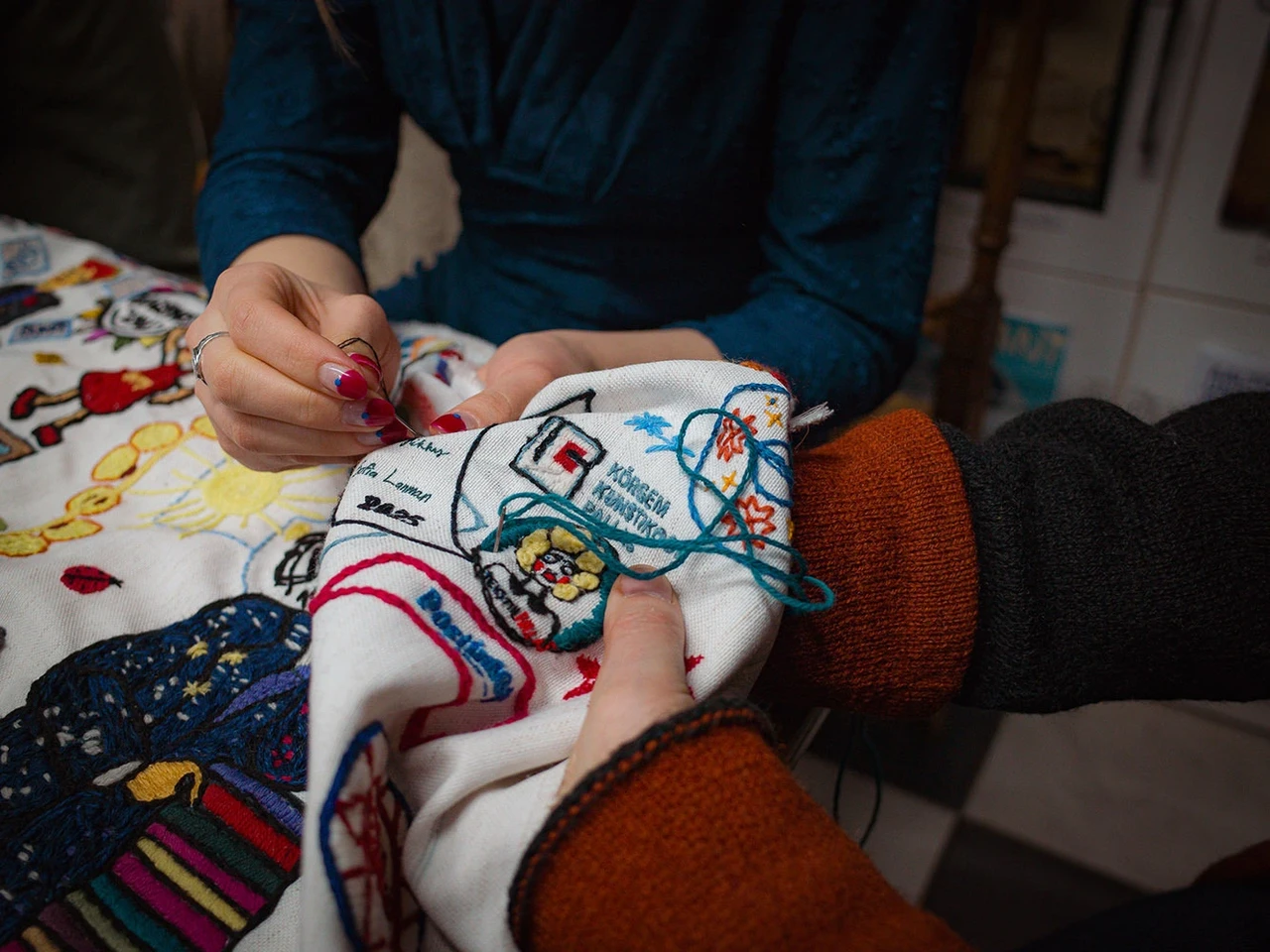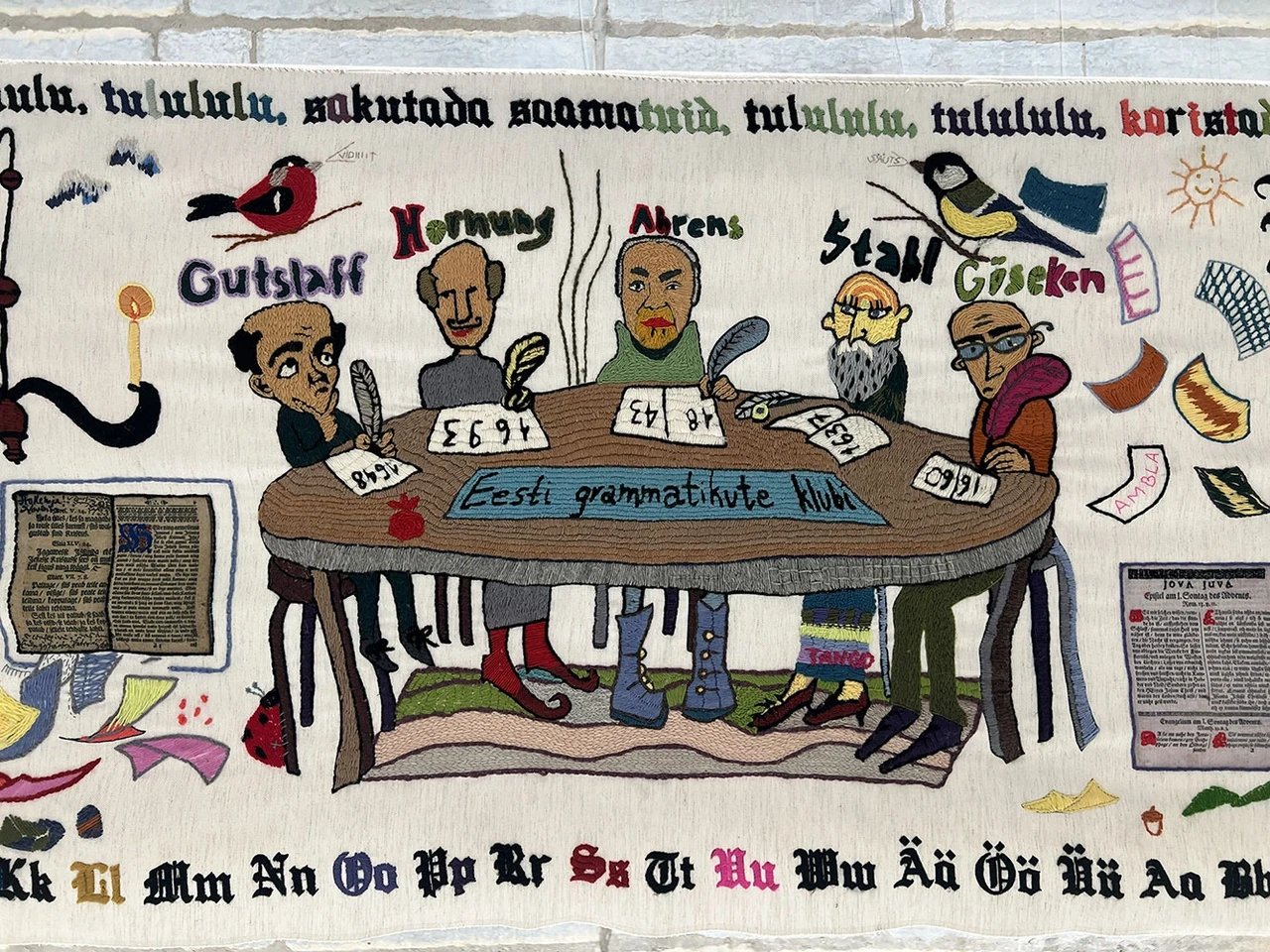 inimest. Kahjuks ei vaevunud osad oma nime logiraamatusse kirjutama. Mingi statistika selt siiski pärast saab. Teadaolevalt on seni olnud kõige noorem tikkija 2 aastane ja kõige vanem 104. Vaip on läbinud ligi 3000 km. Välis-Eesti vaibast on mul väga katkendlikud andmed. Vaip jagati viieks. Just kirja kirjutamise ajal helistati Saksamaalt, küsiti natuke juhendeid ja tänati, et nad saavad nii toredas ettevõtmises osaleda."